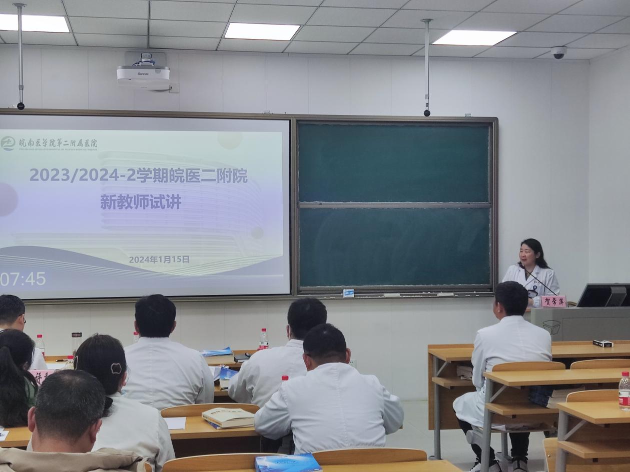 1月15日下午,suncitygroup太阳新城第二附属医院教研室在5号楼四楼智慧教室(二),举行2023/2024-2学期新教师试讲,医院部分教学督导组专家、教研室主任共同担任评委。校教学督导组成员,医院教育处主任贺常萍主持会议,并担任评委组组长。
