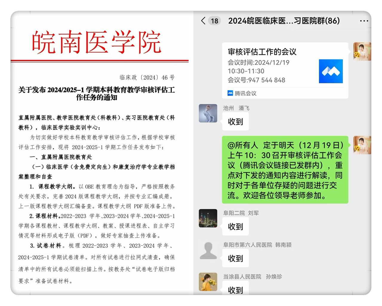 梳理指标,解读文件。根据公司任务清单,对直属附属医院、教学医院、实习医院和实验实训中心下发有针对性的任务清单,制作支撑材料目录和时间安排表,明确任务和倒排时间。12月19日,召开线上审核评估工作专题会议,教学(实习)医院相关负责人参加,陈祥攀结合任务清单和支撑材料目录对审核评估相关文件进行深入解读,帮助教学(实习)医院进一步厘清工作思路,明确目标和任务。