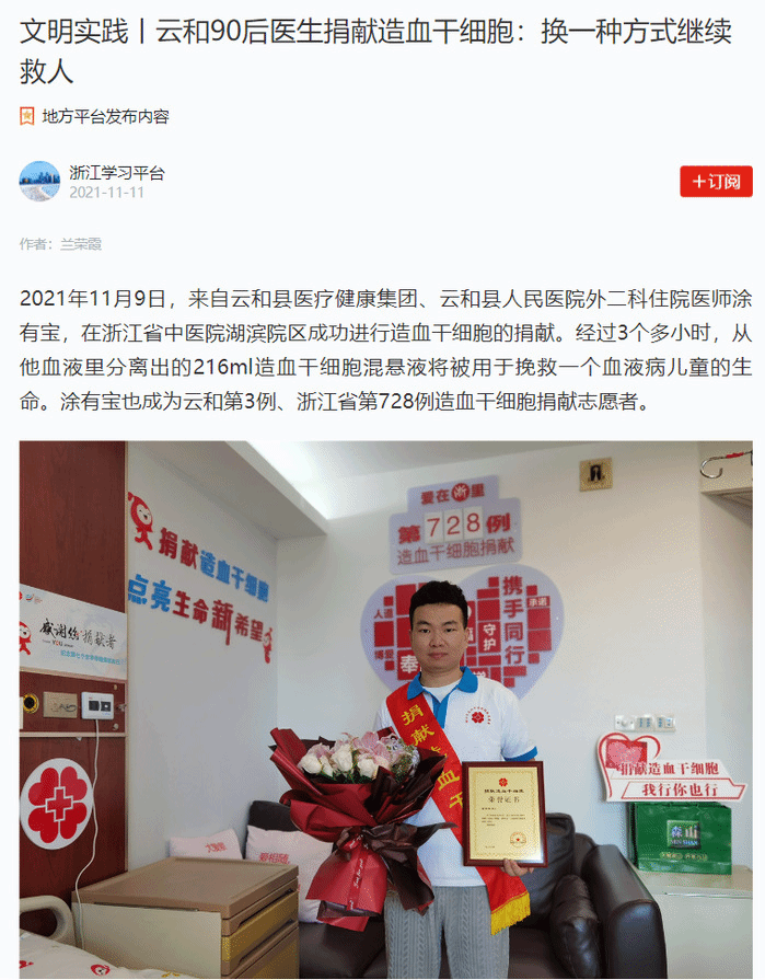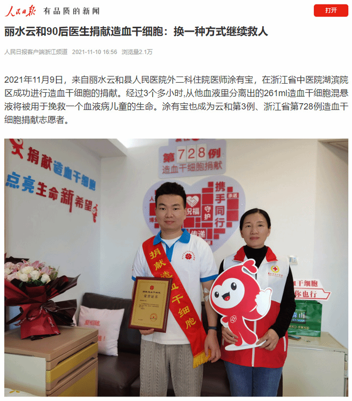 《人民日报》客户端报道公司临床医学专业优秀毕业生涂有宝捐献造血干细胞先进事迹