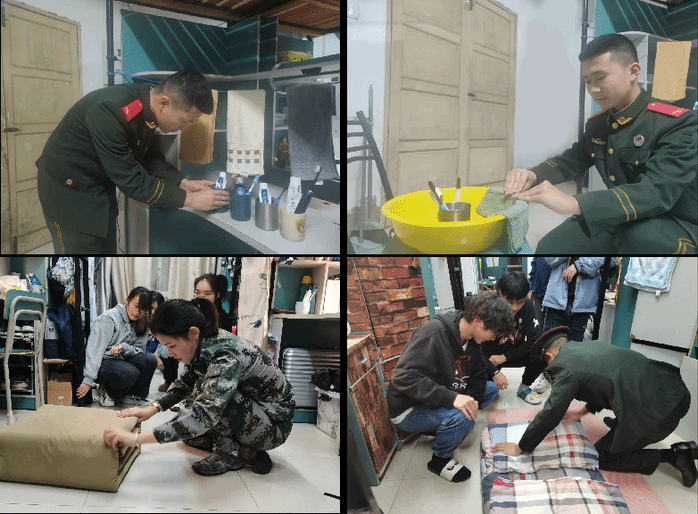 过程中,退伍员工就宿舍物品摆放、被褥折叠等做了详尽细致的讲解示范,讲解了操作要点和重点,强调了内务卫生的重要性,希望同学们能够在寝室内务整理过程中增强团队合作、增进宿舍友情。同学们认真观摩学习,并不时地请教内务整理技巧。