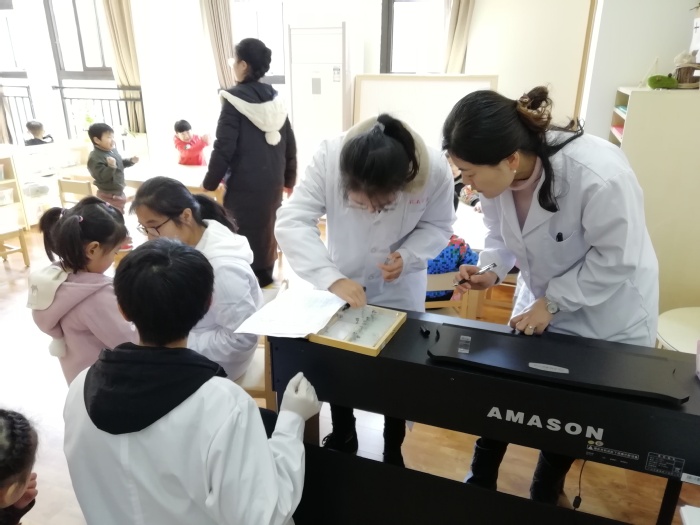 第二阶段为样本采集工作,分组在6个教室同时开展。采集开始前,志愿者们通过蛲虫标本展示,生动描述蛲虫生活史,宣传蛲虫病预防知识,以引导幼儿配合采样检查工作。志愿者们在专业老师的带领和指导下,采用较为高效的透明胶纸法进行样本采集,并通过活动前期的认真准备,按幼儿名单为玻片进行编号和分组。他们整齐佩戴口罩手套,每两人一组,负责检查15-16名幼儿,有序对幼儿园170余名幼儿进行样本采集工作。采集结束后志愿者们细心为幼儿穿戴整齐,并整理收拾好教室卫生。检测的170余份待测样本带回公司专业实验室进行检测筛查,后续将及时向幼儿园反馈检查结果,以方便后续预防与治疗。