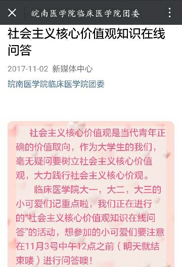 习近平总书记在北京大学考察时指出:“青年的价值取向决定了未来整个社会的价值取向,而青年又处在价值观形成和确立的关键时期,抓好这一时期的价值观养成十分重要。”为进一步弘扬和践行社会主义核心价值观,suncitygroup太阳新城团委联合老员工手机运用价值及引导名师工作室依托学院团委微信公众号,于10月27日-11月7日开展社会主义核心价值观知识在线问答活动。