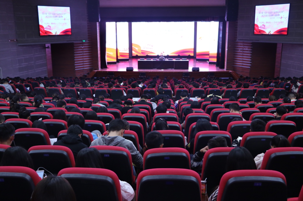 汪教授首先从习近平总书记在十九大报告中说的一句话“久经磨难的中华民族迎来了从站起来、富起来到强起来的伟大飞跃”谈起,展示了中国古代曾经的强盛历史,并用生动的事例详细地向同学们讲述了从近代到现代,在马克思主义等影响下,中国共产党如何团结和带领全国各族人民从贫穷积弱逐步走上民主富裕的艰难历程,展望奔向社会主义现代化强国的奋斗目标,最终实现中华民族伟大复兴的光辉前景。