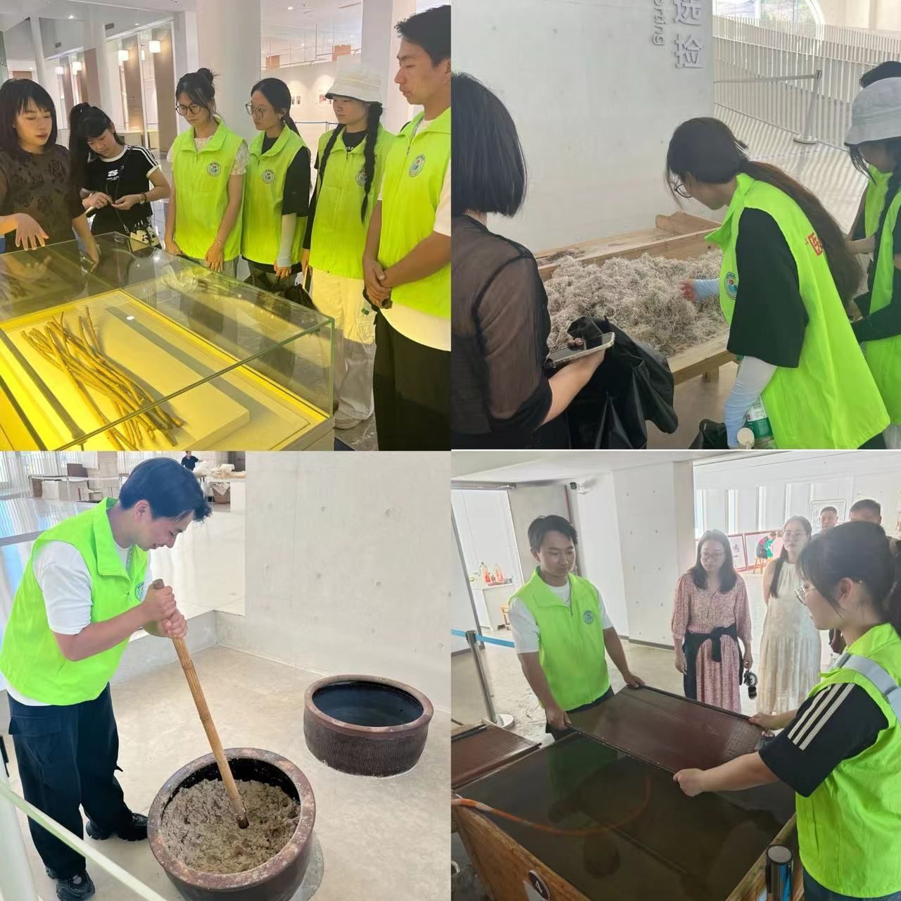 探秘古法纸中乾坤活动首站,团队成员们踏入历史悠久的宣纸文化园,在讲解员的带领下,参观园内珍藏的历代书画作品。一笔一划都浸透着宣纸独有的韵味与温度,同学们也领略到宣纸对于书画艺术传承的重要意义。与此同时,大家还亲身体验了宣纸的诞生过程。它们从最初融合的青檀树皮与沙田稻草,经过一系列操作步骤,成为一张张薄如蝉翼、韧似绸缎的纸张,团队成员也由此深刻体验到了宣纸制作工艺的不易。