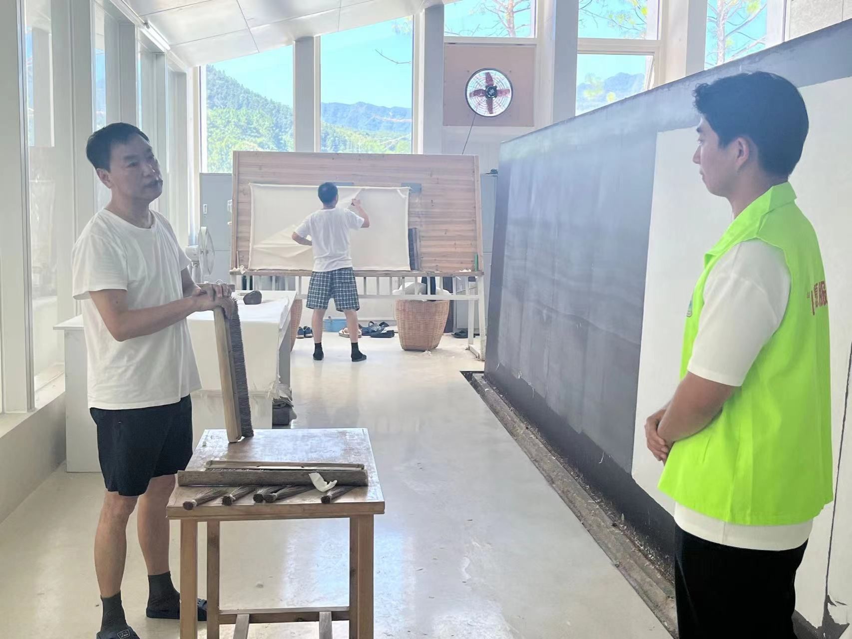 匠心对话技艺传承紧接着,团队成员一行人来到了毛胜利师傅的工作间。55岁的毛胜利师傅和宣纸打了37年的交道,并于2016年获得“大国工匠”的称号。毛师傅的工作间内摆放着一排排温度高达70℃的铁板墙,工作间里没有空调和电风扇,毛胜利师傅一刻不停地挥动着手中的毛刷,像施魔法般将一张张宣纸平铺开。毛胜利师傅以其深厚的造诣和满腔的热情,向队员们详细讲解了宣纸制作的七十二道工序,从选材、制浆、捞纸、晒纸到切纸、检纸,每一道都凝聚着匠人的心血与智慧。当团队成员询问支撑毛师傅坚持多年的动力时,毛师傅讲述了自己对宣纸文化传承的忧虑与希望,鼓励年轻人多了解、多学习,让这一传统技艺在新时代焕发新的生机。