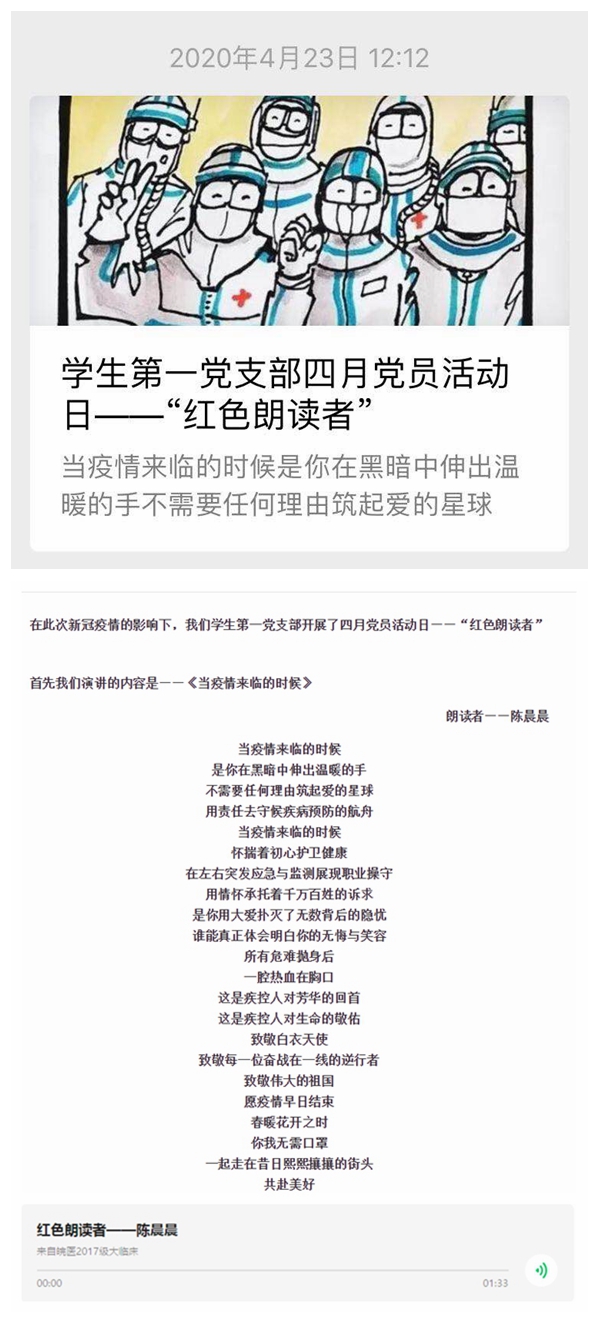 为激发员工的爱国热情,增强员工的社会责任感和奉献精神,党支部开展“红色朗读者”主题党日活动。党员们通过手机录制、公众号上传的形式,在特殊时期用不同寻常的方式,为身在一线的医护人员加油点赞。一段段饱含深情、充满正能量的朗诵有来自名人名家的经典作品,也有党员们自创的诗歌作品。本次主题党日活动用文字、用声音歌颂最美逆行者,不仅丰富了党员教育载体,更以红色精神加强党性修养,筑牢党员初心。
