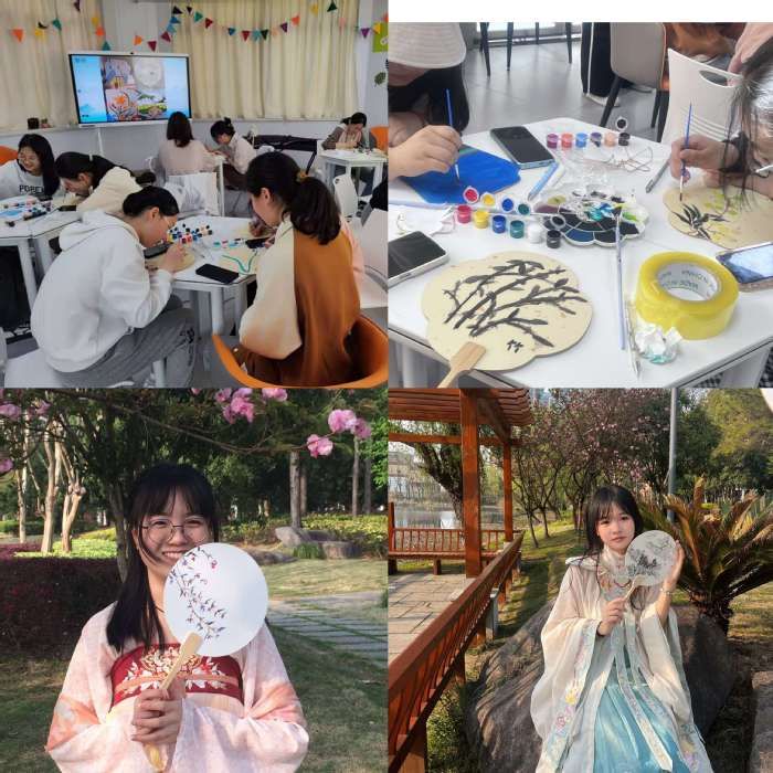 制团扇,展风韵。团扇,是传统工艺品及艺术品,寓意团圆友善、吉祥如意。活动过程中,同学们充分发挥想象力,手握画笔在扇面上进行描绘,经过一个小时的精心创作,一把把融入中国传统意境美、诗意美的团扇绘制而成。伴随着明媚的春光,同学们身着汉服,手握团扇,走进大自然,与春日美景一起合影。