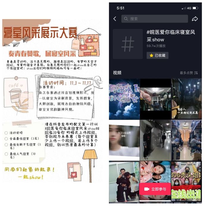 2020年11月3日至30日,2020级新生以寝室为背景,精心拍摄、制作短视频,并发布在抖音平台“皖医爱你临床寝室风采show”中。本次寝室风采展示大赛在员工中反响热烈,共征集到118个寝室的121个作品,累计播放量近60万次,单个作品最高点赞量达1473次,不少员工家长在视频下点赞、留言、转发,他们纷纷对公司开展丰富有趣的寝室文化生活表示支持,同时也弥补了因疫情原因进入公司参观孩子宿舍的遗憾,拉近了家庭与公司的距离。