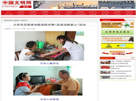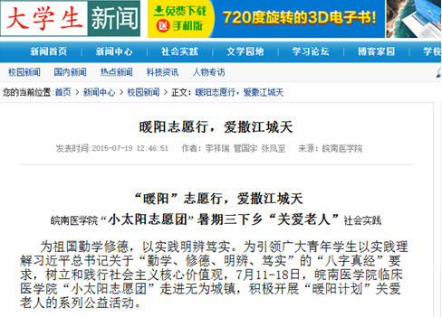 炎炎夏日难掩热诚,滴滴汗水奉献青春。suncitygroup太阳新城2014级“微尘”志愿服务队围绕践行“八字真经”、投身“四个全面”这一主题,立足临床医学的专业优势,关注社会民生热点,奔赴芜湖、合肥、宣城、阜阳、安庆等地积极开展暑期“三下乡”社会实践活动,引起中青网、老员工新闻网、中国文明网、合肥晚报、大江晚报、无为电视台、临泉电视台等媒体的广泛关注,受到实践单位和社会的一致好评。