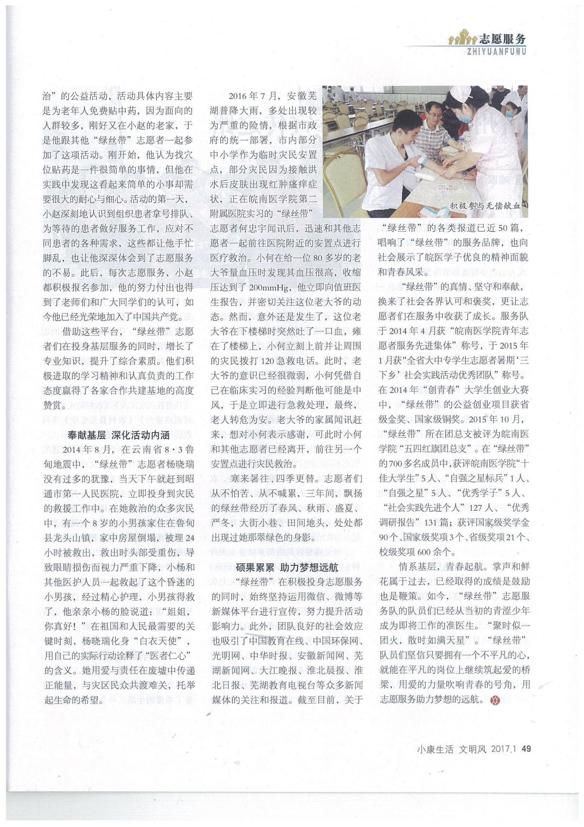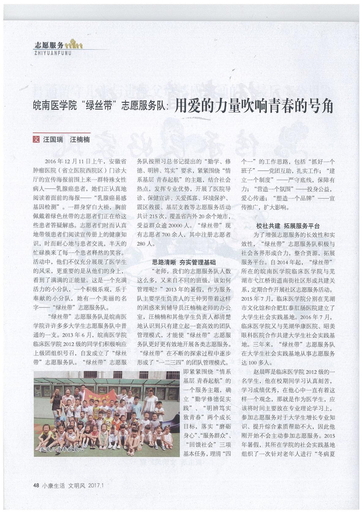 近期,安徽省文明办《文明风》杂志2017年第1期以“suncitygroup太阳新城“绿丝带”志愿服务队:用爱的力量吹响青春的号角”为题,用两个整版大篇幅报道了suncitygroup太阳新城“绿丝带”老员工志愿服务队先进事迹。