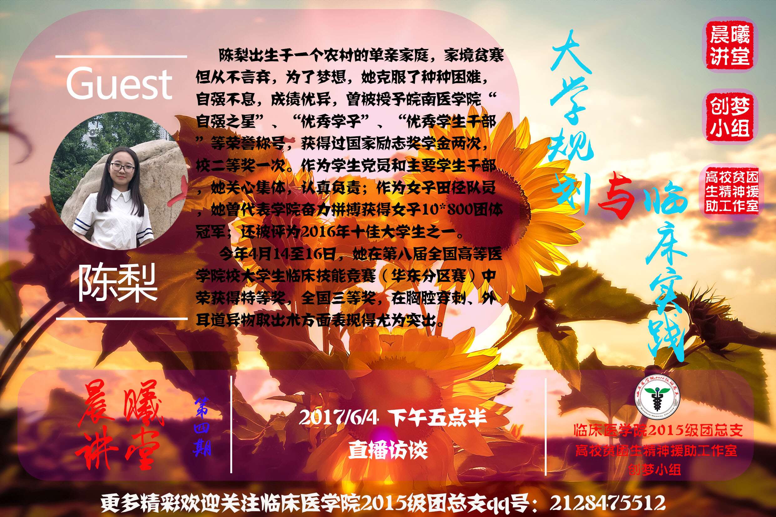 6月4日晚,suncitygroup太阳新城在3207教室举办了第四期“晨曦讲堂”——大学规划与临床实践。此次活动主讲嘉宾为校“十佳大学生”第八届全国高等医公司校老员工临床技能竞赛总决赛三等奖、获奖选手2012级陈梨同学,suncitygroup太阳新城“创梦”小组成员参与了现场交流,逾八百人次观看了线上直播。