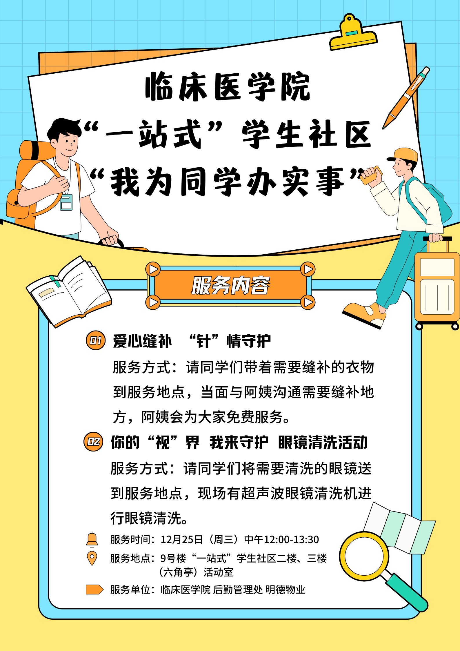 为更好地服务员工,给同学们提供便利,打造温馨、便捷的员工社区环境,12月25日,公司联合后勤管理处、明德物业在“一站式” 员工社区开展“我为同学办实事”活动,为同学们缝补衣物、清洗眼镜。
