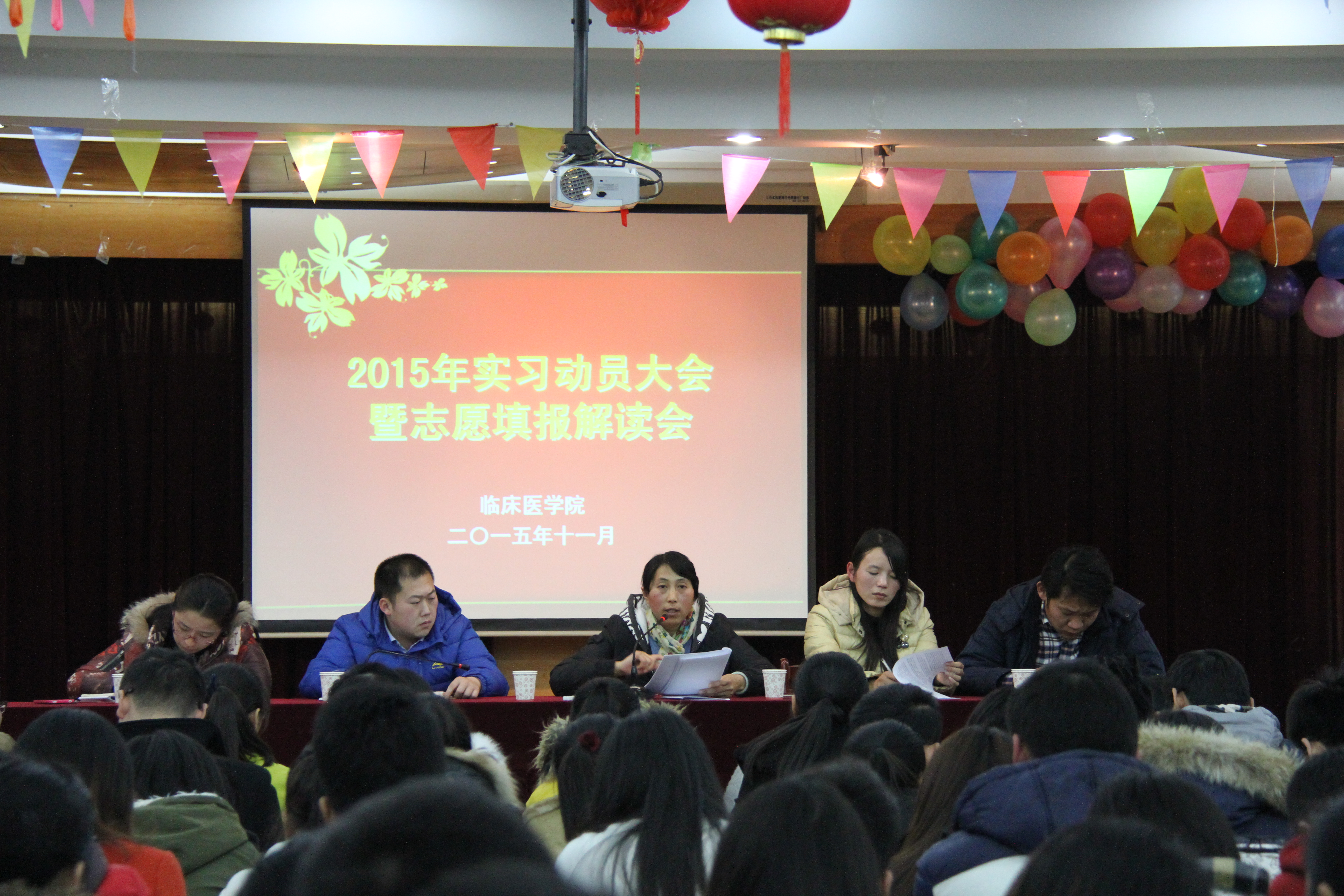 11月27日晚,suncitygroup太阳新城在赭麓校区4号教学楼七楼报告厅召开2015年实习分配动员大会暨志愿填报解读会,会议由suncitygroup太阳新城教学工作秘书王平主持,suncitygroup太阳新城副经理刘影、2012级辅导员以及全体在校员工、部分芜湖市临床公司员工参加了本次会议。