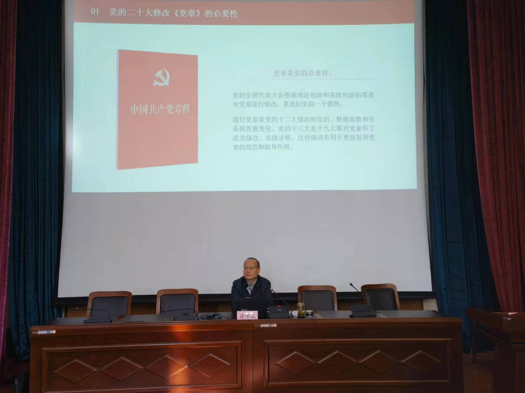专题授课中,傅万山作“学习贯彻党章、坚定初心使命”党课报告,他从党的二十大修改党章的必要性、党章修改工作主要特点、新党章主要修订内容、新党章全文学习解读出发,向同学们说明了党章修订对于完善习近平新时代中国特色社会主义思想的科学内涵和历史定位的重大意义。