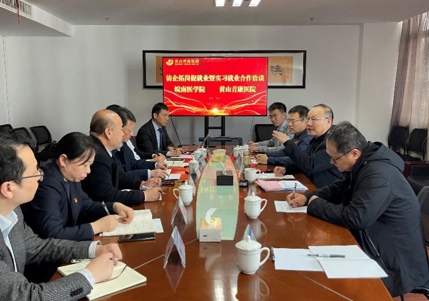 4月1日下午,傅万山等一行五人来到黄山首康医院。座谈会上,黄山首康医院董事长徐建平、经理贾全章、副经理翁延宏对公司人员来访表示热烈欢迎,并就医院团队队伍建设、用人需求进行了介绍,表达了对医学人才的迫切需求。傅万山希望双方在就业和实习等方面进行深度合作,继续推进就业实习一体化建设,为毕业生创造更大发展空间,搭建更好就业平台,拓宽员工就业渠道。公司人员向黄山首康医院推荐本科毕业生66人(其中临床医学36人、康复治疗学3人、医学影像学3人、护理学22人、麻醉学1人、临床药学1人)、研究生10人,并现场将员工简历递交医院,医院表示同意录用。