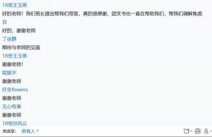 随后,傅万山、陶香香分别与同学进行了交流。傅万山就同学们提出的困难给予了回复,并在会后立即与医院协调解决。同时,他提出三点要求,一是要求全体同学严格按照疫情防控属地管理的要求,高度配合属地、医院和公司的管理,紧守底线;二希望大家克服生活上的困难,发扬艰苦奋斗精神,共克时艰;三是希望全体同学保持良好生活习惯,管理好自己的生活和学习。陶香香在心理健康、舆情引导等方面给予同学们几点建议。
