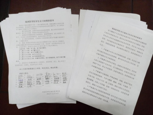 临床实习是医学教育中的一个极其重要的过程,是基础理论与临床实践结合的关键环节。为了明确实习期间的纪律要求,年级组织召开了实习规章制度和安全教育学习会,学习了《suncitygroup太阳新城员工违纪处分管理暂行办法(试行)》中的相关规定,强调了实习期间的规章制度问题和安全问题。并让同学们以班级为单位签署了《suncitygroup太阳新城员工实习知情承诺书》和《2013级实习生安全责任承诺书》,让同学们更好地进行自我教育和自我管理。