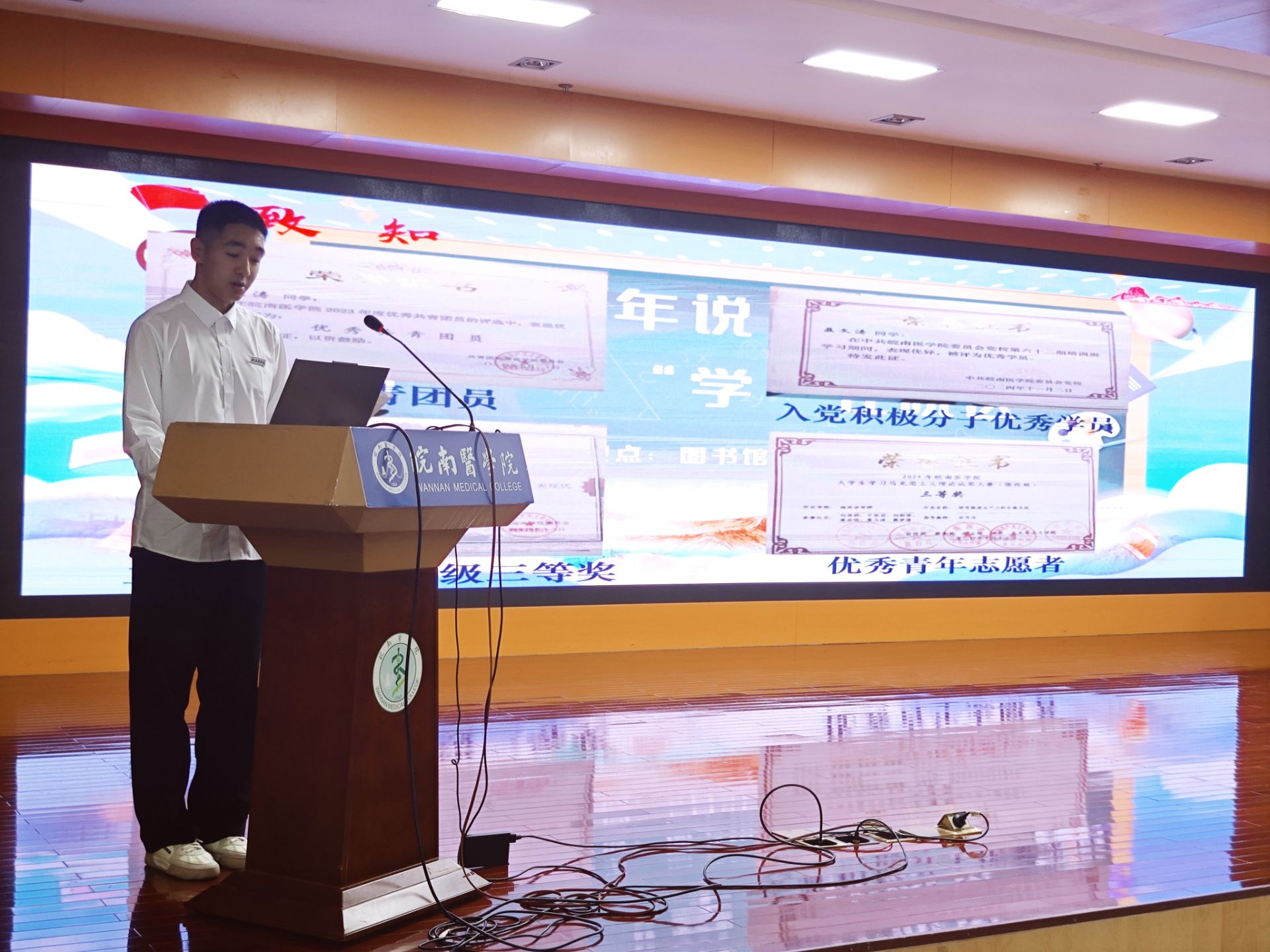 2023级临床专业聂文涛同学以“有爱帮助,照亮前路”为题分享了医学学习中的互助故事,传递携手同行的温暖力量。他表示从高中到大学,国家、公司的资助始终是照亮求学路的光;进入大学后自己躬身实践、笃行不怠,通过课堂与图书馆的日夜深耕让专业成绩稳步提升;主动组织建立学业帮扶小组,互相讲解难点、共享笔记资源,把自己的学习方法与老员工活经验化作实在的分享,既是对学弟学妹的指引,更是将曾经获得的光亮进行传递。