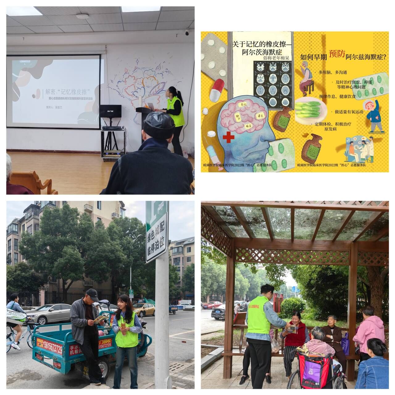 预防老年痴呆,点亮记忆之光10月16日,“医心”志愿服务队成员一同前往镜湖区镜湖新城社区开展“关于记忆的橡皮擦”阿尔茨海默症科普宣传活动。通过PPT宣讲和发放宣传单的方式让更多老年人了解阿尔海默症的症状、危害以及预防方法。此次活动帮助老年人了解了阿尔海默症的病因、预防措施,传播了科学的生活方式,提高老年人自我防范意识。