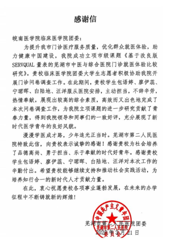 志愿者分为多个小组,在医院门诊大厅、候诊区和诊室开展问卷调查。问卷内容涵盖医疗服务质量、医患沟通、就诊环境等多个维度,采用改良版SERVQUAL量表进行科学评估,同学们耐心细致地向患者解释问卷内容和填写方式,并认真记录反馈意见,确保了数据真实性与有效性。共收集有效问卷四百余份,为课题研究提供了宝贵的一手资料,同学们的工作得到了医院的高度认可,芜湖市中医院和芜湖市第二人民医院团委均发来感谢信表示对公司及临床学子的感激之情。