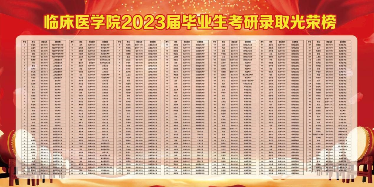 “非学无以广才,非志无以成学”。随着2023年全国硕士研究生招生录取结果陆续公布,公司捷报频传,临床医学专业毕业生考研喜获佳绩。全院共有临床医学专业毕业生738名,425人通过国家录取分数线,最终299人拟录取,其中78人录取到中国科学技术大学、上海交通大学、复旦大学、同济大学、中山大学、南京大学等双一流大学。