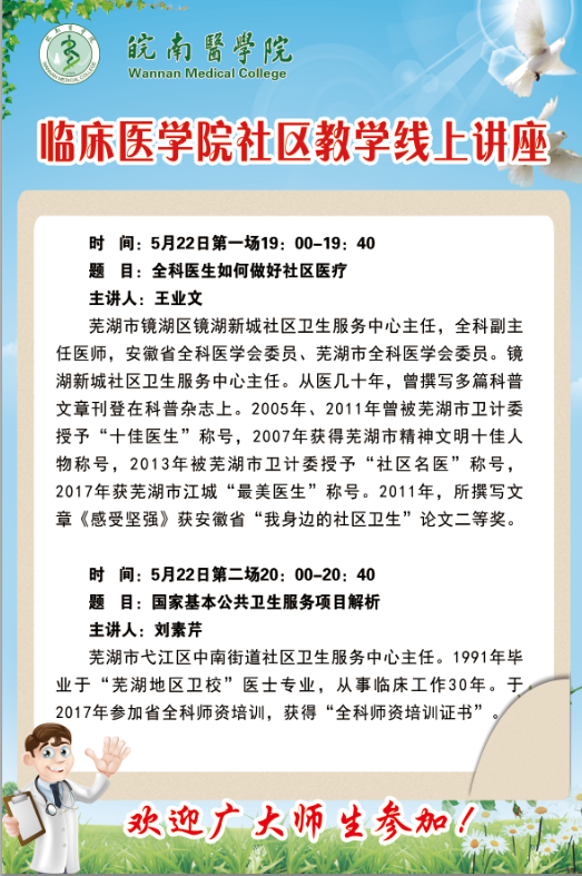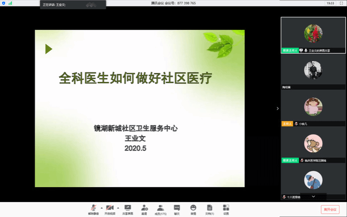 为加强员工对社区医学知识和社区卫生工作的了解,5月22日晚,suncitygroup太阳新城邀请镜湖区镜湖新城社区卫生服务中心主任王业文和弋江区中南街道社区卫生服务中心主任刘素芹两位专家作“社区教学”线上讲座。本次讲座由秘书汪国瑞主持,各年级辅导员和全体临床医学免费定向生通过腾讯会议聆听讲座。