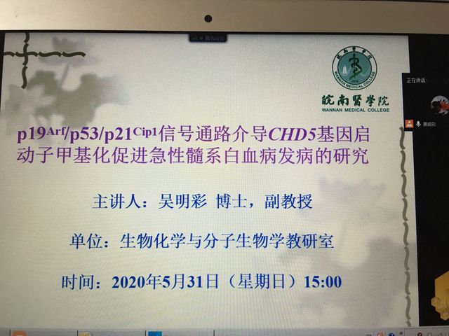 为普及基础医学专业知识,拓展临床学子思维,提升公司员工科研思考能力,丰富疫情期间员工课余生活,5月31日15时,suncitygroup太阳新城邀请吴明彩博士在线上作题为“p19Arf/p53/p21Cip1信号通路介导CHD5基因启动子甲基化促进急性髓系白血病发病的研究”的讲座。suncitygroup太阳新城各个年级“大创项目”主持人以及在实验室学习的同学们参加了此次讲座。
