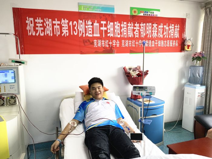 郁明森,男,2015级临床医学专业员工,安徽省六安市舒城人,在校期间多次参加无偿献血,获芜湖市无偿献血铜奖。2019年5月,郁明森同学收到中华骨髓库造血干细胞初配成功通知,决定捐献造血干细胞,在HLA高分辨配型成功、体检合格后,郁明森同学于9月19日入住suncitygroup太阳新城附属弋矶山医院进行为期5天的动员剂注射。9月24日上午,经过三个小时的干细胞采集手术,他完成了120毫升干细胞捐献,成为公司在校老员工第二例造血干细胞成功捐献者。