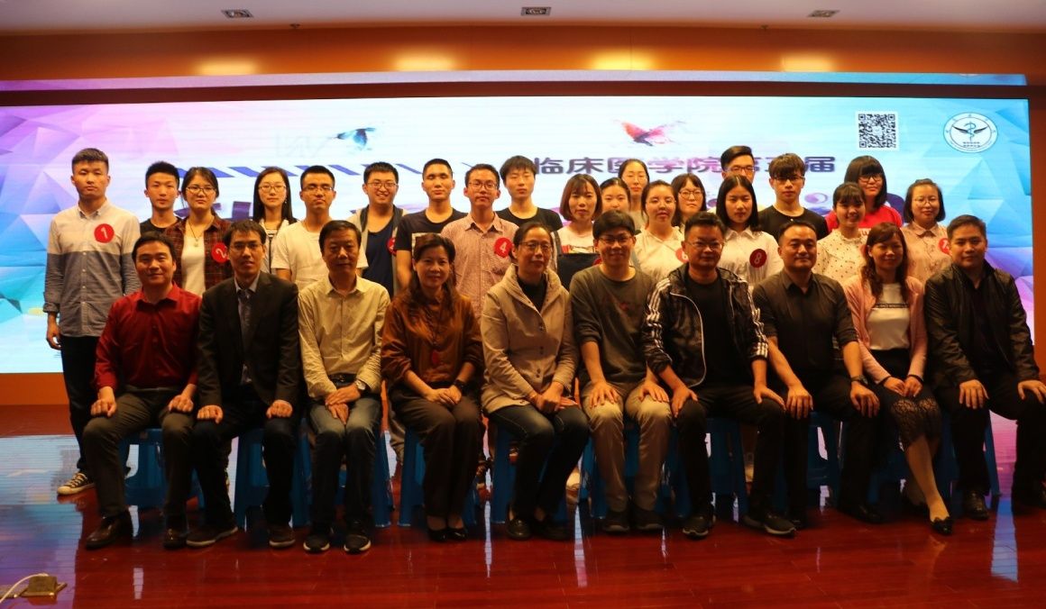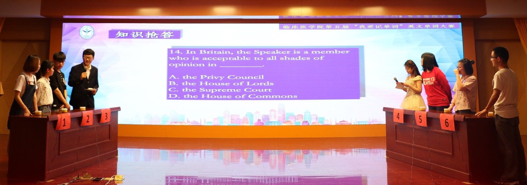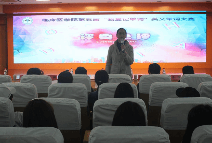 语言魅力共彰显,教无止境同前行。为进一步激发员工英语学习的积极性,提高学习趣味性,推进优良学风建设。4月27日晚,公司联合高校贫困生精神援助工作室、习近平新时代中国特色社会主义思想青年学习社,在图书馆三楼学术报告厅隆重举办了第五届“我爱记单词”英文单词大赛决赛。大赛邀请公共基础公司外语教研室王翠莲、赵军和李东老师担任评委,外事处处长赵梅、团委副书记余亮等担任指导嘉宾。临床医公司党政领导和各年级辅导员出席比赛现场。比赛采用中英文双语主持,公司各年级近400名同学到场观摩学习。
