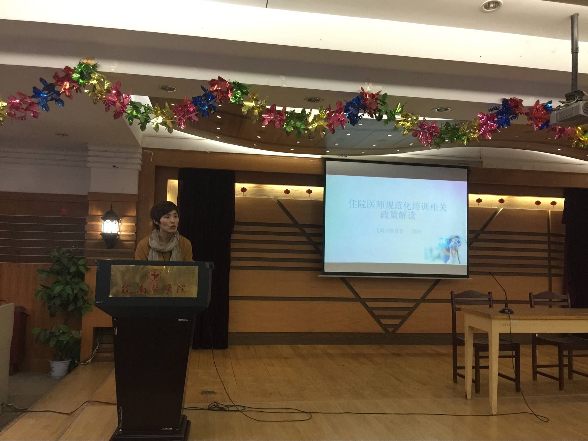 为进一步加强和做好毕业生就业指导工作,帮助高年级员工深入了解住院医师规范化培训的政策和实施办法,确定有效的科学的职业发展目标,2018年5月15日晚7点,suncitygroup太阳新城于赭麓校区四号实验楼七楼报告厅举办“医学大讲堂”系列讲座之住院医师规范化培训政策解读,讲座特邀到suncitygroup太阳新城第一附属医院教育处主任、安徽省住院医师规范化培训管理与督导专家徐艳老师主讲,suncitygroup太阳新城副经理、党委副书记李曙主持,辅导员代表、2013级、2014级员工代表共计200余人到场聆听。