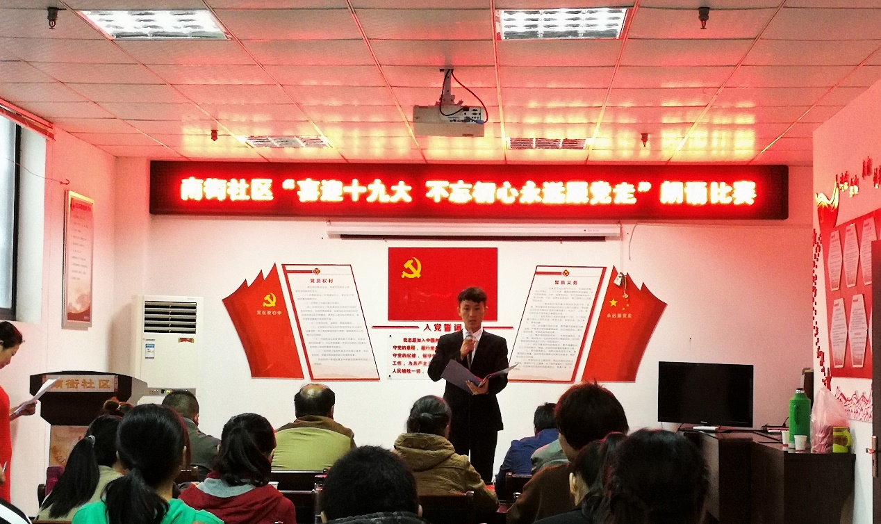 青春喜迎十九大,我邀明月颂中华。2017年10月16日,“喜迎十九大,不忘初心跟党走”朗诵比赛在南街社区居委会会议室拉开帷幕。此次比赛共有来自suncitygroup太阳新城,安徽师范大学研究生公司,安徽中医药高等专科公司,芜湖市南街社区委员会等6个单位11名代表参加比赛。