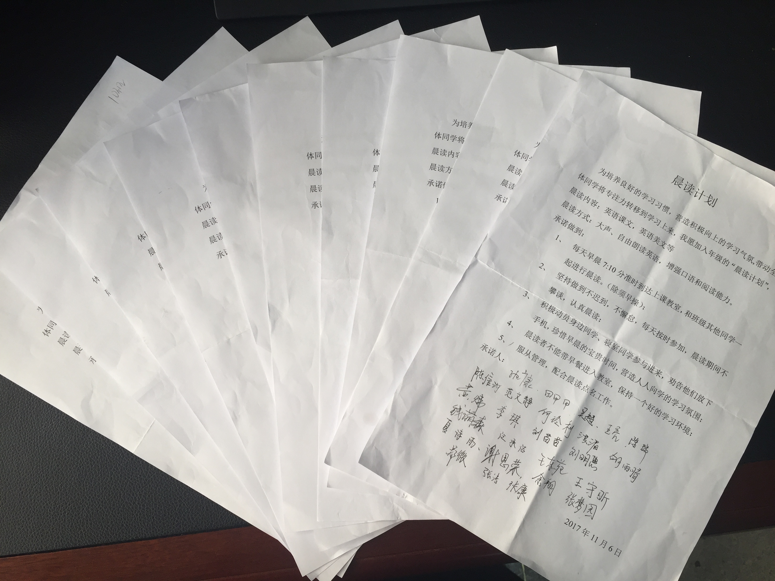 此次晨读计划活动,由年级牵头组织,先是要求各班班委同学每周一到周五早上7:10到达上课教室开始晨读,通过自由、大声地朗读英语课文、英语美文等,吸引班级更多的同学自觉加入到晨读队伍中来,坚持做到不迟到、不懈怠,晨读期间不攀谈。同时,为了加强晨读纪律的管理,各班班长与学习委员相互配合,负责晨读考勤和管理工作。