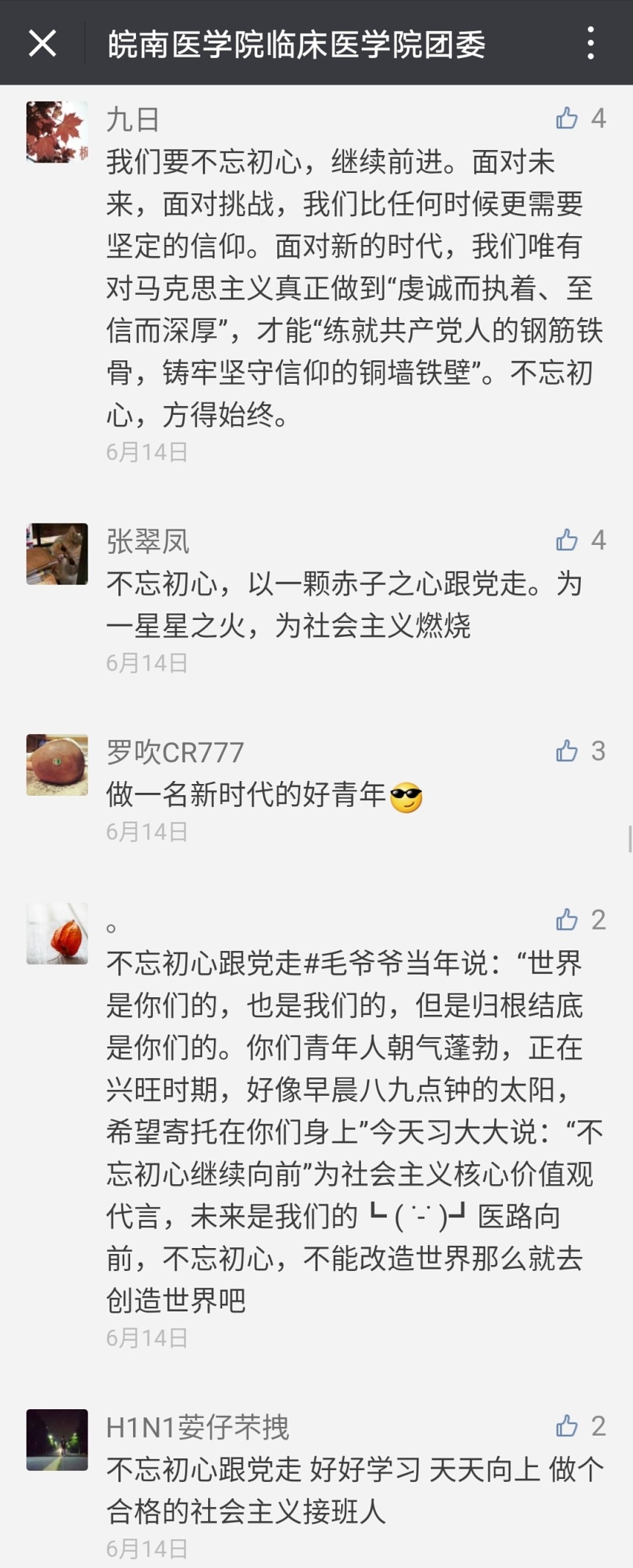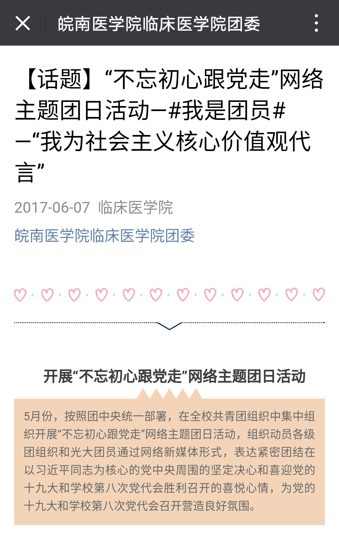 红心向党,凝聚思想。为响应共青团中央关于“学习习近平总书记讲话,做合格共青团员”教育实践号召,增强团员的荣誉感和使命感,2017年6月7日,suncitygroup太阳新城团委依托新媒体,在全院范围内成功开展不忘初心跟党走”网络主题团日活动。