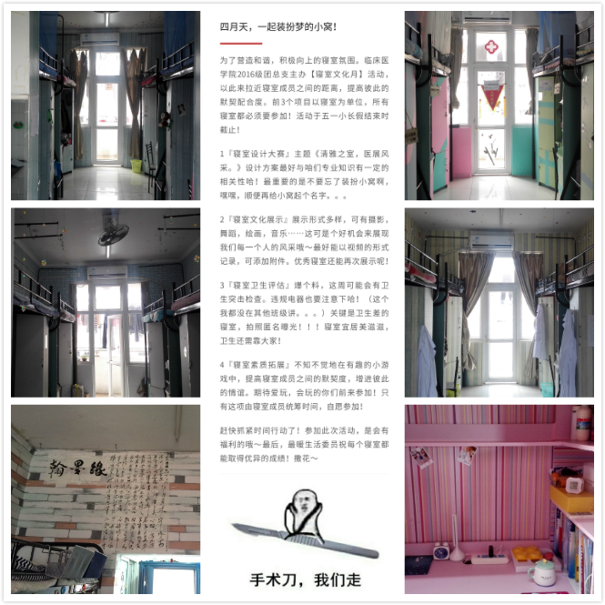 “四月天,一起装扮梦的小窝”,大家席地而坐,商榷设计方案,一起装扮自己的小窝。洁净整齐的寝室、跃动鲜明的色彩、清新风雅的主题都凝聚了小伙伴们的聪明才智和辛勤的汗水,在讨论中大家认真倾听他人的方案同时提出自己的见解与建议。有结合专业特色设计的“医学研究协会”;有变废为宝装扮的“简朴寨”;有书香四溢的“翰墨轩”等等,寝室设计青春朝气,清新明快,布局整齐统一,主题鲜明。