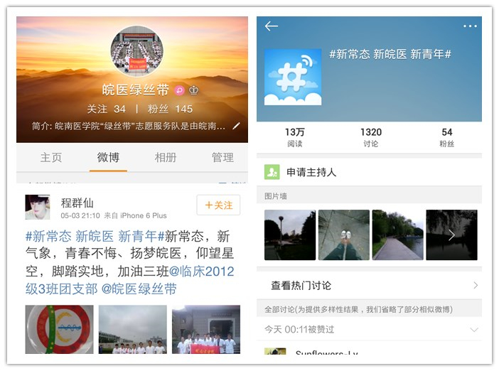 五四前后,2012级团总支在新浪微博发起了“新常态 新皖医 新青年”的微话题讨论。同学们结合自己的老员工活,在微博上各抒己见,踊跃发言,纷纷表示面对新常态,更要保持“心常态”,不忘作为医员工的责任,做走在时代前列的新青年。截至发稿时,在新浪微博上搜索关于“新常态 新皖医 新青年”的微话题,共有1300余条相关微博参与讨论,累计阅读量突破13万次。