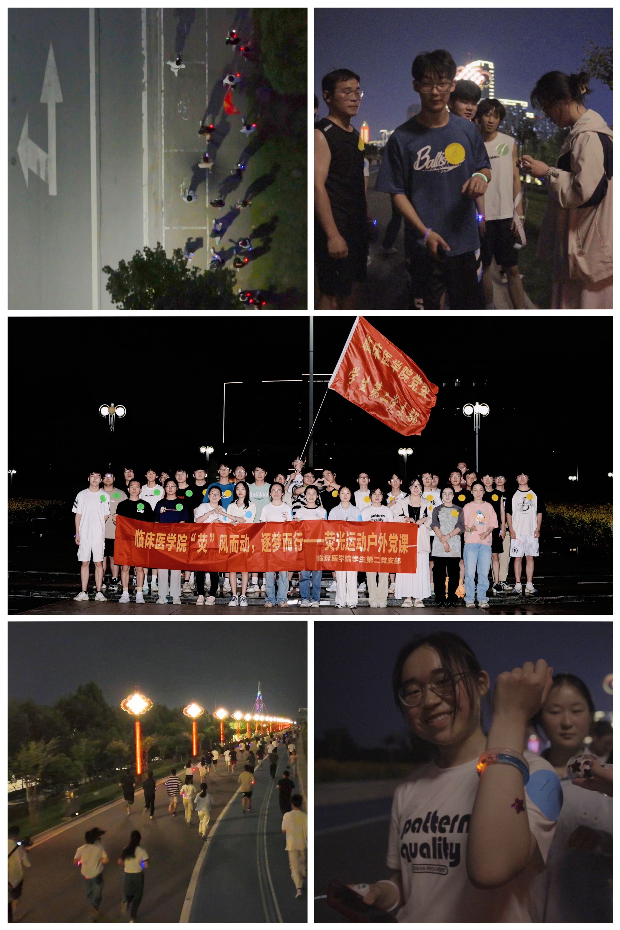 6月4日晚上,员工第二党支部在十里江湾公园开展荧光夜跑活动。在5公里的夜跑中,同学们佩戴荧光手环,分成三组在跑道上挥洒汗水前往指定地点进行贴纸打卡,点点荧光中绽放出同学们青春洋溢的面庞。同学们纷纷表示,这次荧光夜跑活动带领他们走出教室、走下网络的同时,更帮助他们舒缓了学习压力,在运动和团队合作中找到了乐趣。