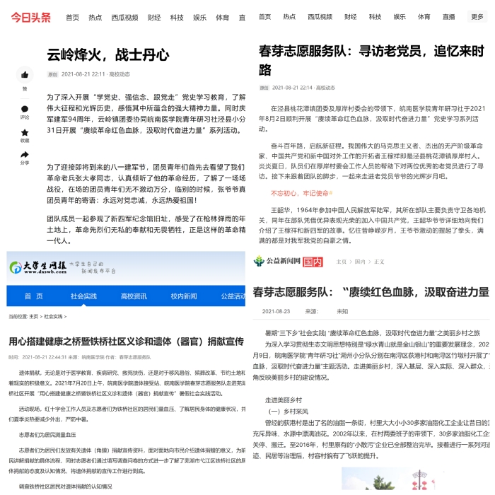 “百年一望传薪火,风华一道赴新程。”为深入开展“学党史、强信念、跟党走”学习教育,引导广大青年学史明理、学史崇德、学史增信。2021年7月31日-8月20日,“春芽”志愿服务队前往宣城泾县、滁州来安、安庆潜山、六安金寨等地实地探访红色历史文化古镇,重温革命根据地创建历程,开展 “赓续革命红色血脉,汲取时代奋进力量”的学习党史系列活动。